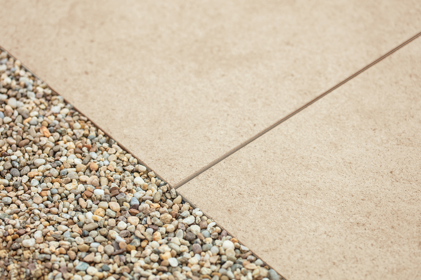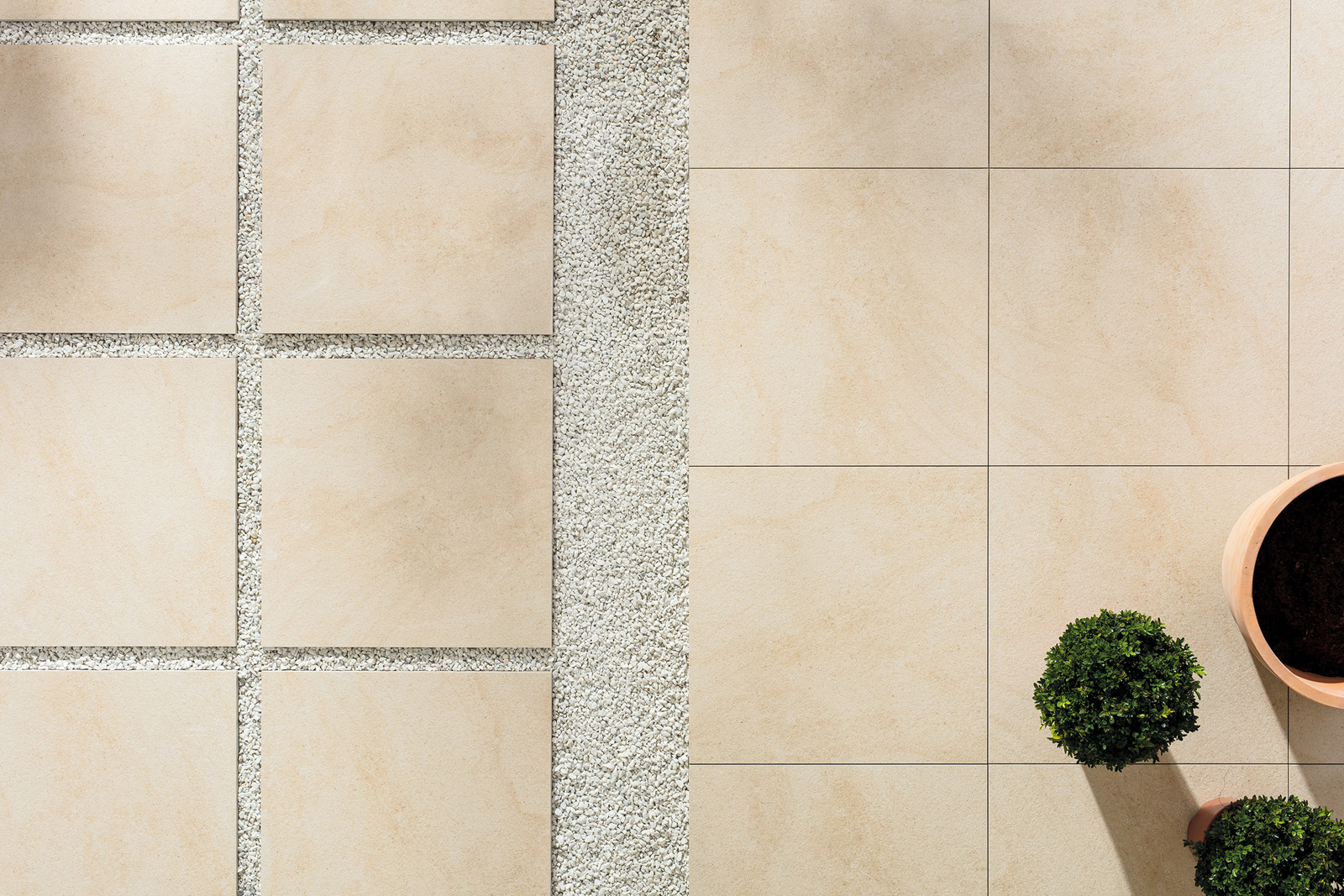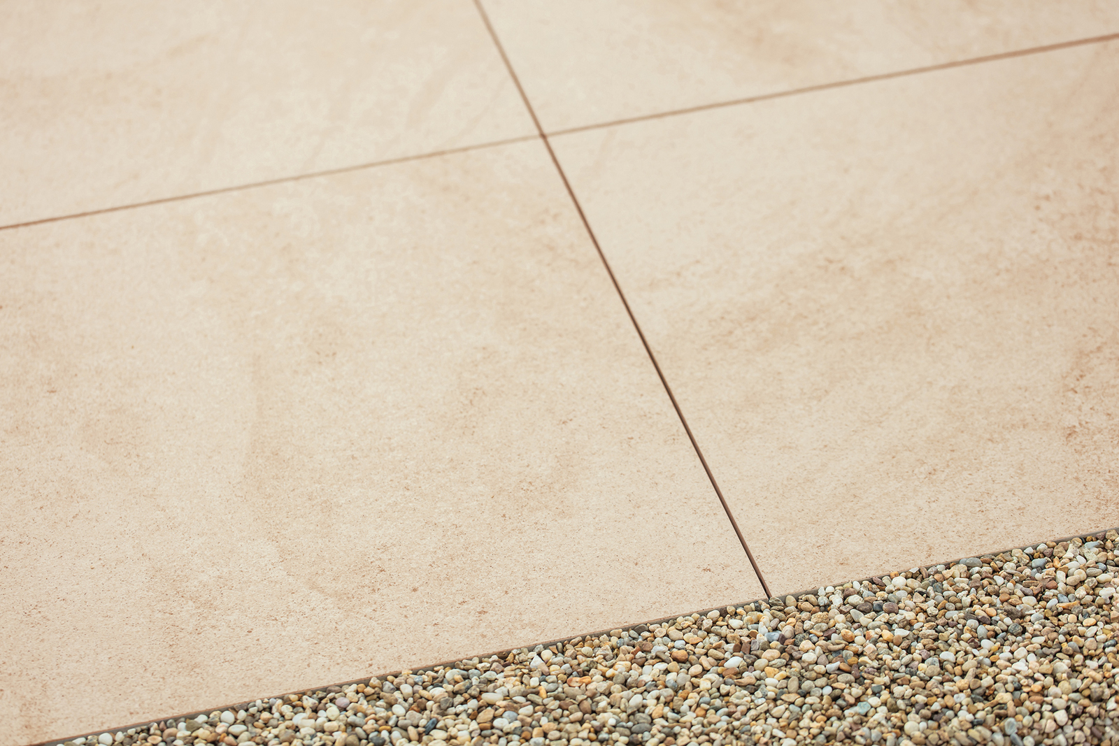 Fliesen für den Außenbereich im Format 60×60 cm in drei helleren Farbtönen bieten einen harmonischen Übergang zwischen dem Innen- und Außenbereich Deines Hauses.