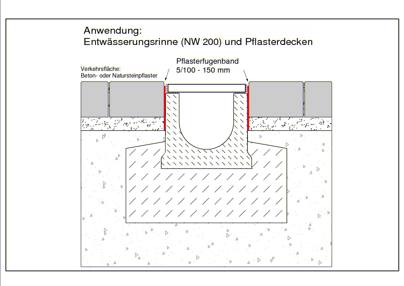 Fugenfüllstreifen als Raumfuge im Anschluss an Kasten- und Schlitzrinnen in gebundener und ungebundener Pflasterbauweise, und in Asphaltbauweise.