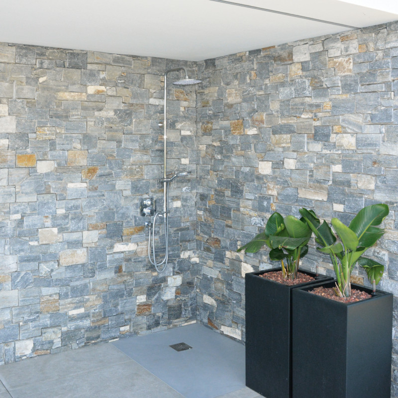 Die Befestigung erfolgt mit einen hochwertigen Natursteinkleber, der auf der Rückseite der Verblender angebracht wird. Eine anschließende Imprägnierung der Steinwand wird im Aussenbereich empfohlen.